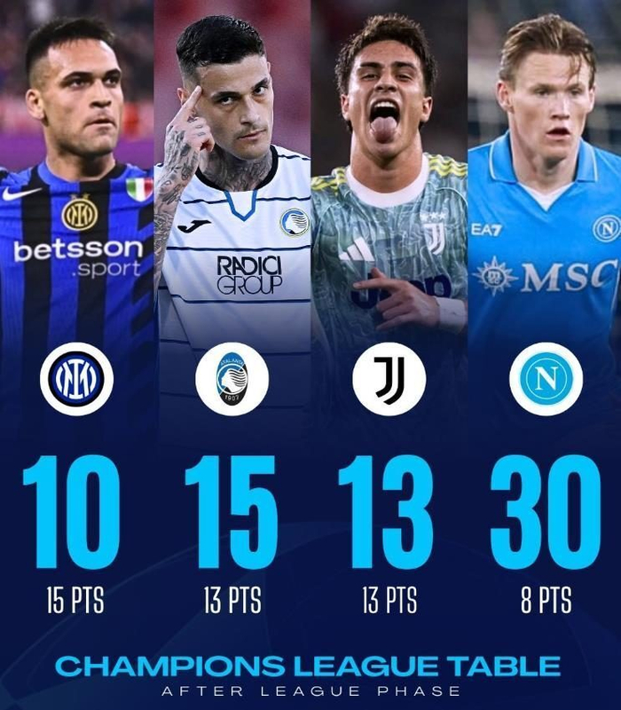 看看本赛季意甲球队在欧冠赛场上的表现,国际米兰身为意甲榜首,上赛季欧冠亚军,却在附加赛被来自挪威的博德闪耀主客场双杀,以2比5的总比分耻辱出局,创造了队史首次被非五大联赛球队淘汰的黑历史。至于尤文图斯在首回合2-5惨败给加拉塔萨雷,次回合虽然顽强扳平,但最终仍在加时赛中倒下。而那不勒斯身为意甲冠军,早在欧冠联赛阶段就提前出局,8轮仅拿8分。至此,四支参加欧冠的意甲球队,三支在附加赛或联赛阶段就宣告死亡,仅存的亚特兰大,在16强首回合就被灌了个1比6。这是何等的悲哀?